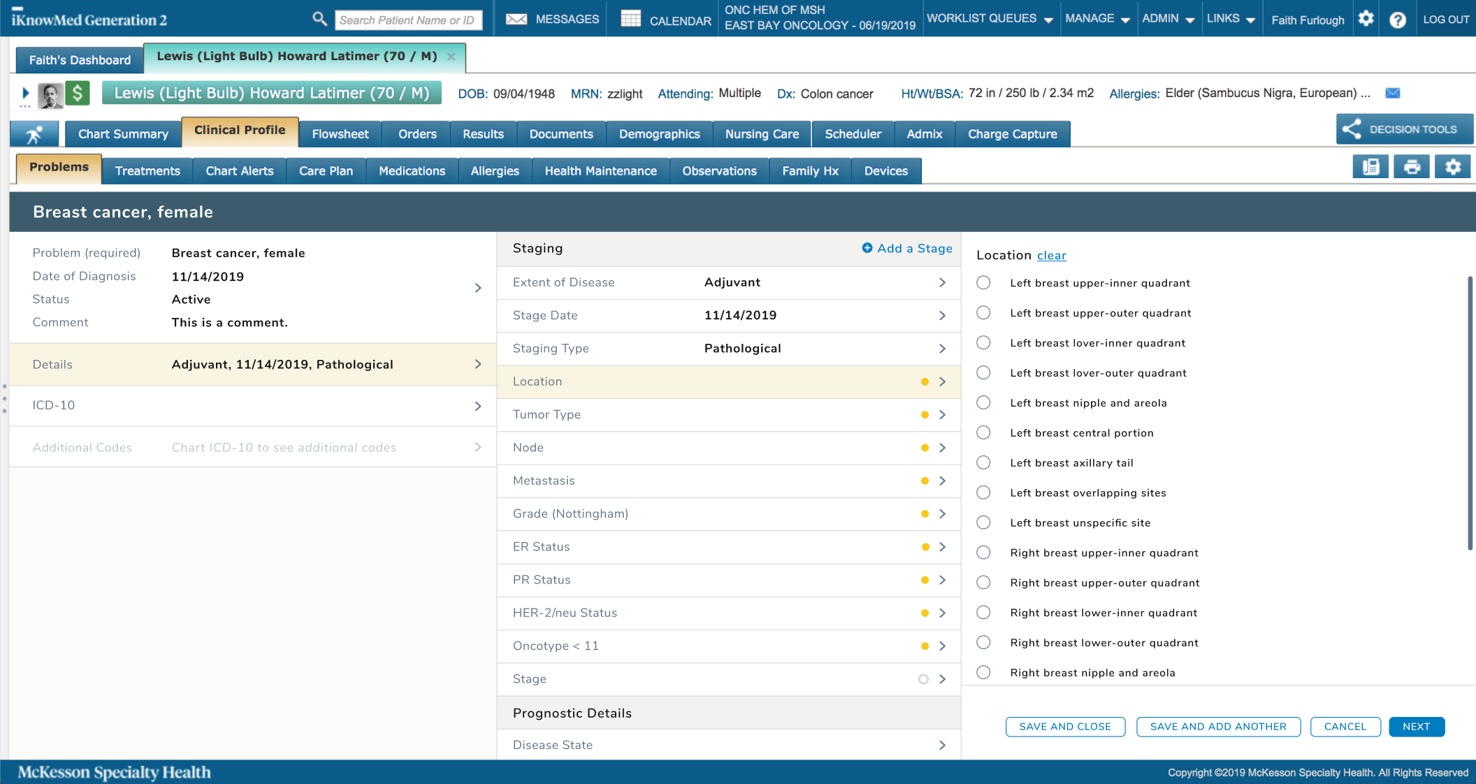 The Oncology EHR system, a mature clinical platform used daily by healthcare providers.