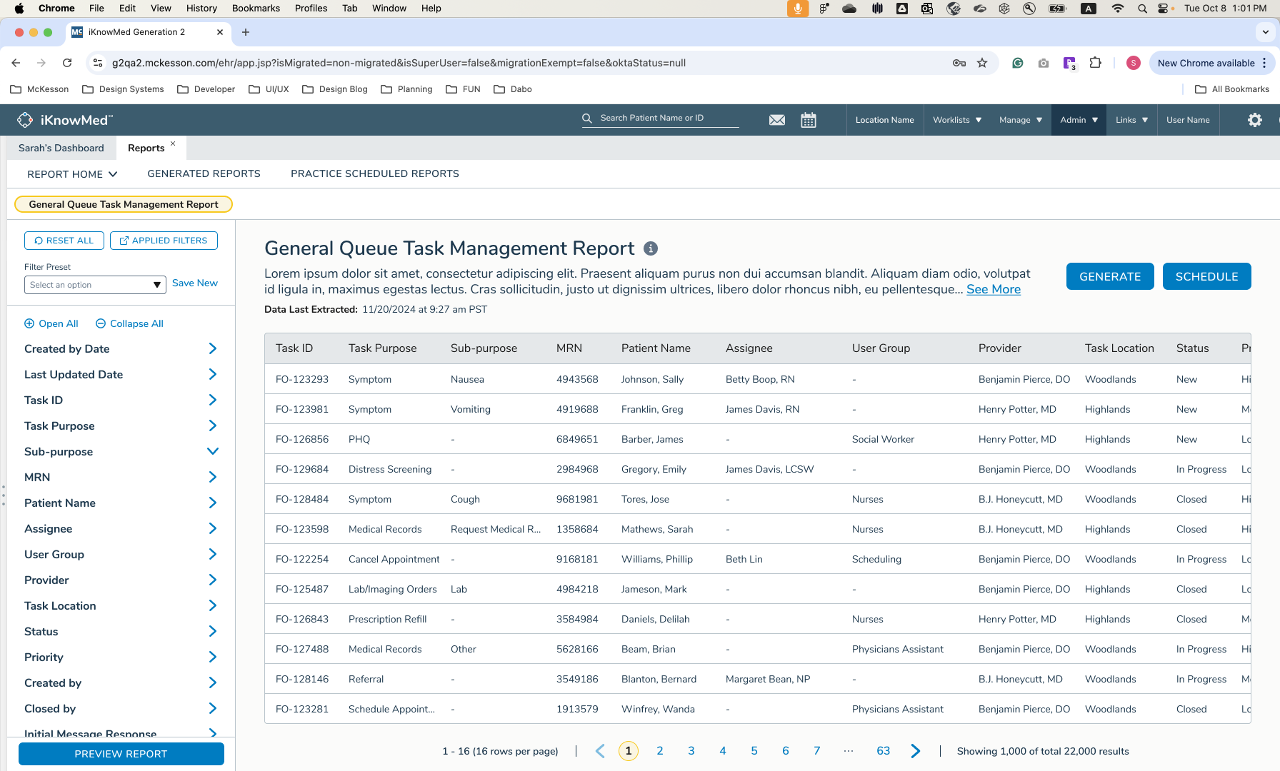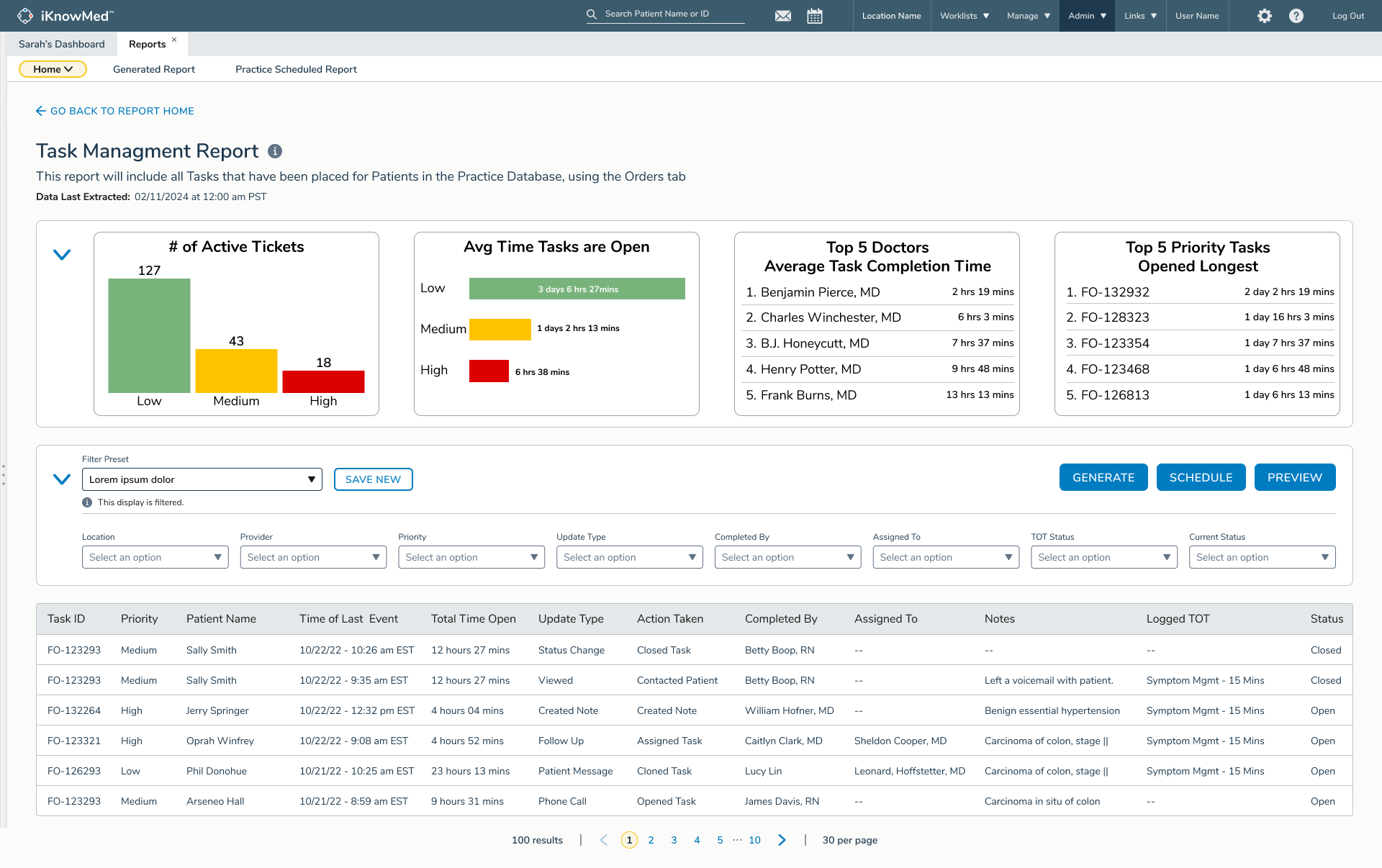 This report provided a high-level view of task activity across practices and locations, enabling administrators to identify trends and operational bottlenecks. Key questions it answered included: