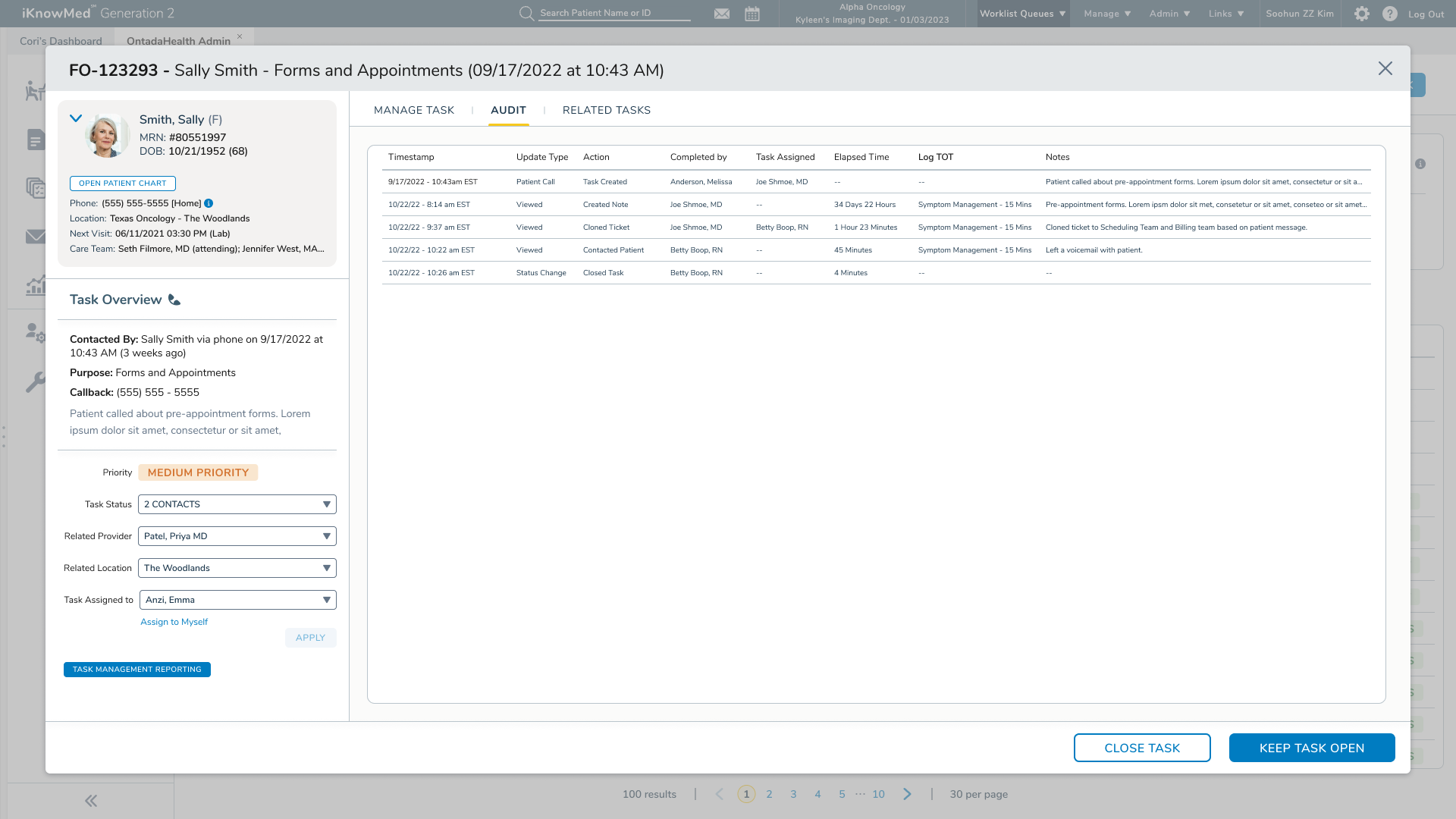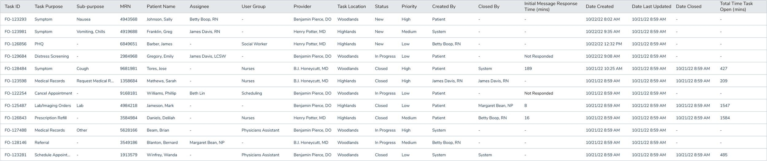 Within a clinical office workflow, every incoming phone call or internal assignment generates a Task inside the EHR. Each task may include multiple events, often handled by different team members, and can be transferred between users as work progresses. While the task model effectively tracked activity, administrators lacked visibility into how work was actually being performed across teams, locations, and time.