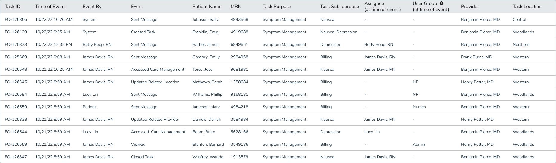 For example, while the Task Report could show how many high-priority tasks a location closed in a week, the Event Report could reveal how long a specific nurse spent completing assigned events across all of her tasks.